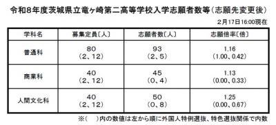 令和8年度茨城県立竜ヶ崎第二高等学校入学志願者数等(志願先変更後)