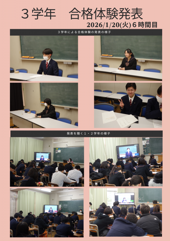 1・2年生全クラス対象で、3年生による合格体験発表を実施しました。
