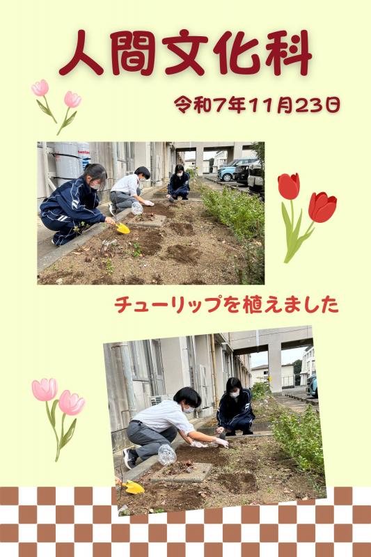 家庭クラブ員が、花いっぱい運動を実施しました。調理室前の花壇にチューリップの球根を植えました。