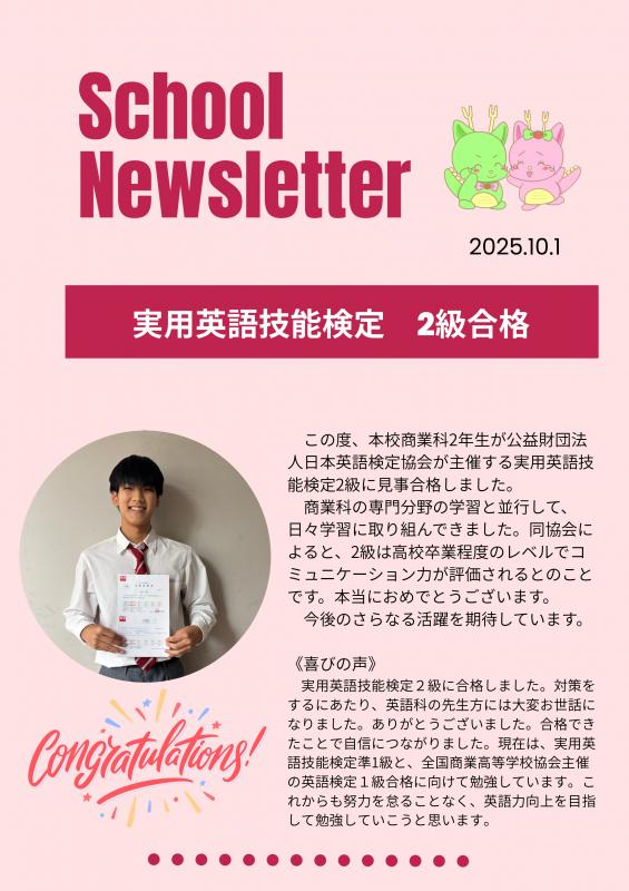 商業科在籍の2年生が実用英語検定2級に合格しました。
